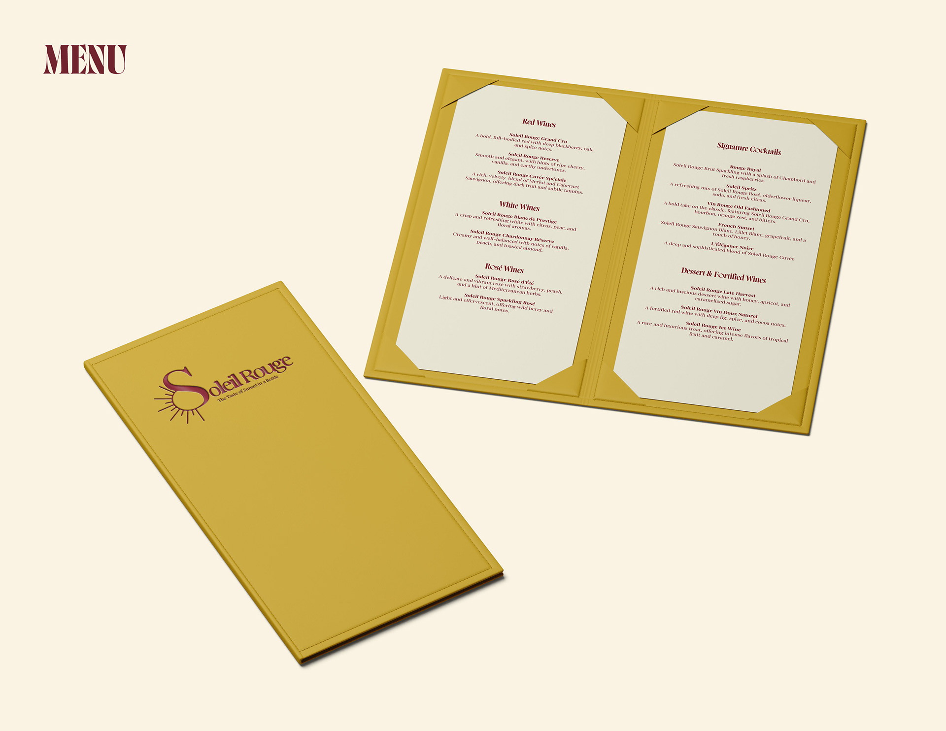 The final identity blends modern sophistication with vineyard heritage. Soleil Rouge now presents a clean, luxurious look that communicates quality and tradition in a fresh, visually compelling way.